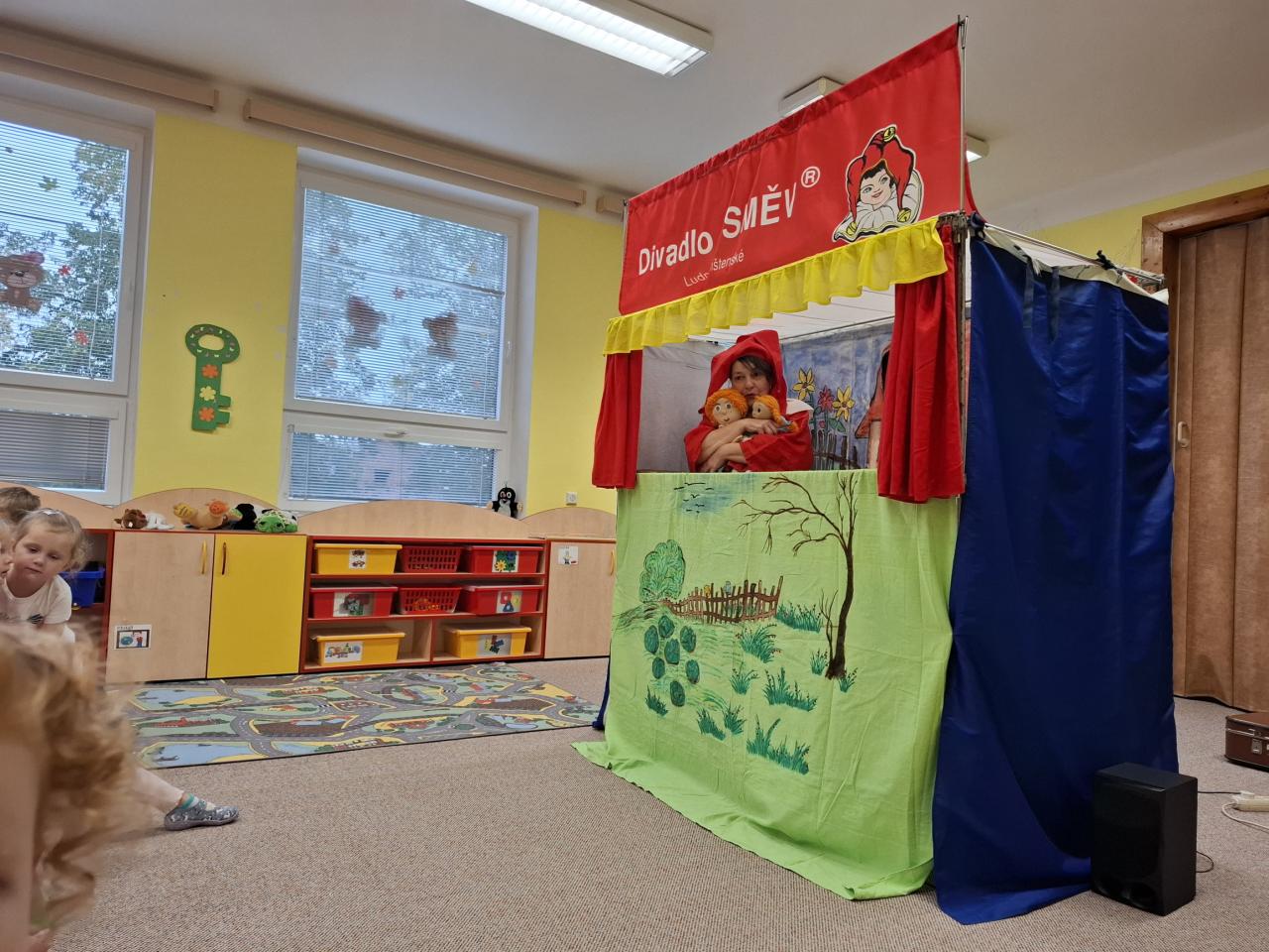 Dne 25. 9. děti shlédly maňáskové představení s kašpárkem "O kamarádství" provázené písničkami a pohádkou o zvířátkách.