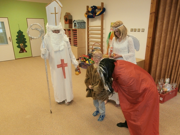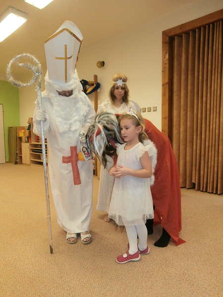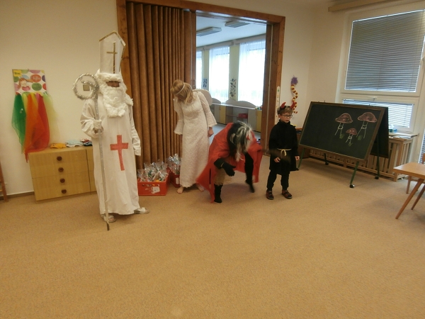 V pondělí 4. prosince jsme uspořádali v mateřské škole Mikulášskou nadílku. Některé děti se proměnily do postaviček "čertíků" nebo "andílků". Děti byly zpočátku trochu netrpěliví, ale Mikuláš oblečen v bílém rounu v doprovodu "rohatého" a anděla je nenechal dlouho čekat a záhy vstoupili do prostoru herny. Odvážlivci vzácné návštěvě přednesli mnoho básní a zazpívali i pěkné zimní písničky. Všichni i ti méně odvážní si zaslouženě odnesli domů balíčky s ovocem a čokoládovou figurkou. V průběhu dopoledne nechyběl i tanec na reprodukovanou "čertovskou" hudbu.