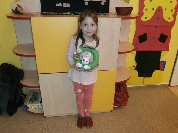 Koncem března jsme v odpoledních hodinách připravili pro rodiče a děti pracovní dílnu. Vyráběli jsme zajíčka ve věnečku, děti si vybíraly různé drobné dekorace a s rodiči vše pečlivě nalepovaly tavící pistolí na ovinutý věneček pytlovinou. Nakonec si děti s radostí odnášely zhotovené dekorace domů a těšily se na blížící se svátky jara. Děti se ještě v mateřské škole naučily velikonoční koledy, s kterými se jistě předvedly při pondělním koledování.