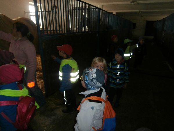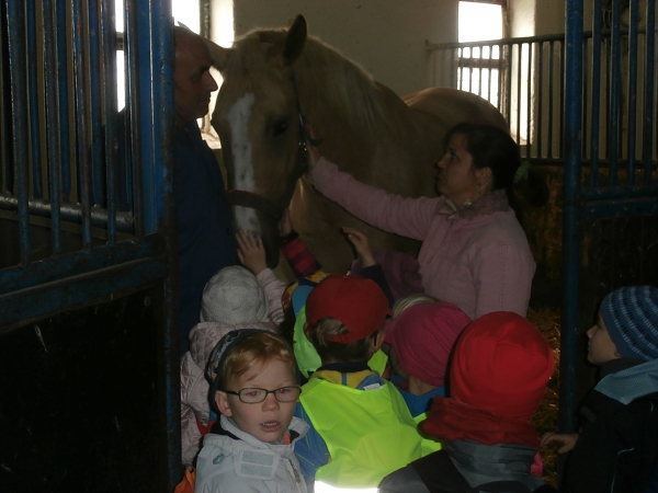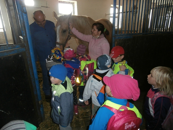 Dne 4. října jsme se turistickým pochodem vypravili se staršími dětmi na prohlídku jezdeckého klubu JK Izabel pana majitele Vladislava Vosáhly v Zadražanech. Počasí jsme měli sice chladnější, ale hlavně bez dešťových kapiček. Prohlédli jsme si stáje a klidnějšího koníka jsme si měli možnost pohladit. Pan majitel nám o chovu těchto krásných zvířat pověděl mnoho zajímavostí. Před cestou nazpět jsme se posilnili svačinkou a koníkům jsme předali pečivo a jablíčka. Velmi děkujeme panu Vosáhlovi za milé přijetí a věnovaný čas našim předškoláčkům.