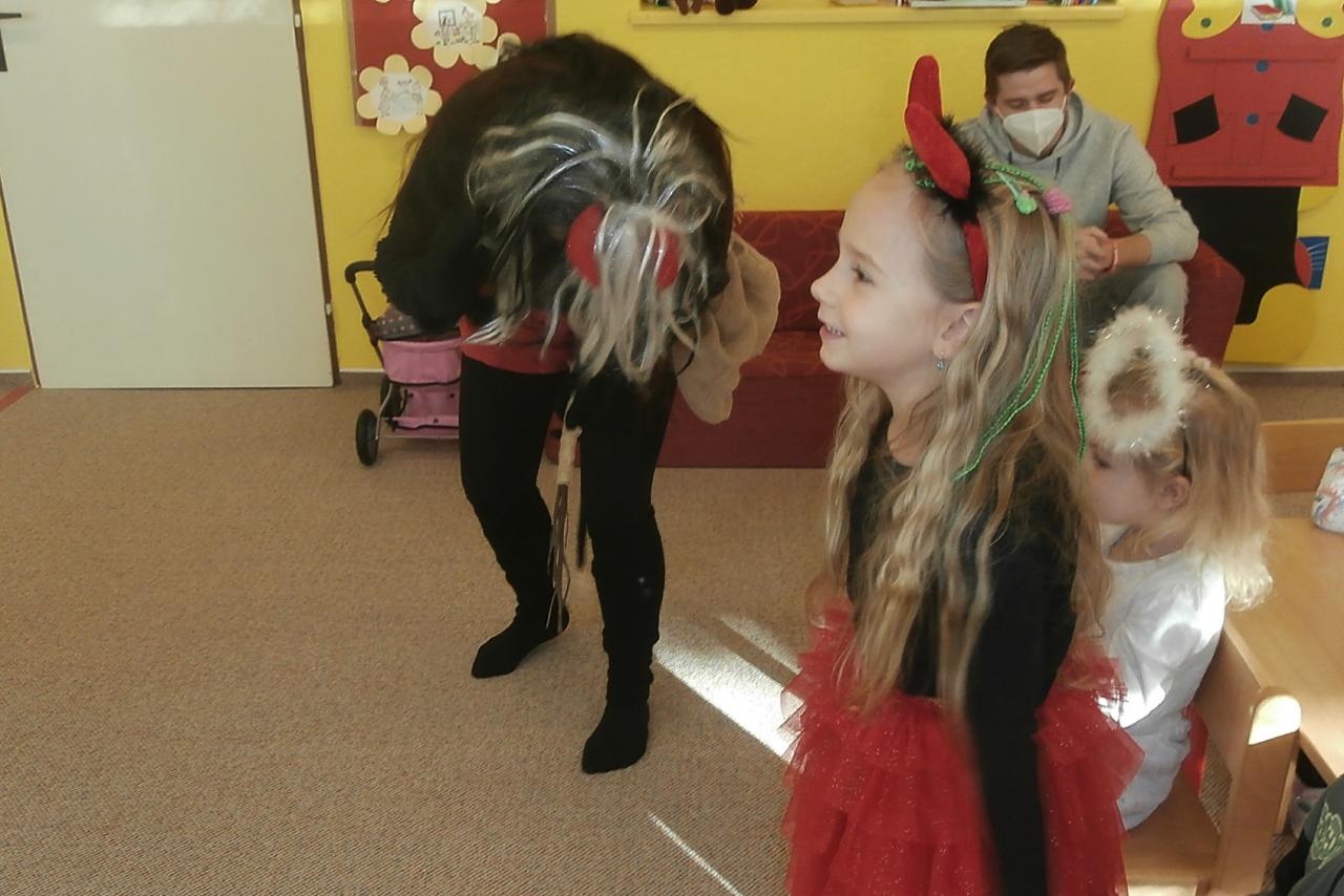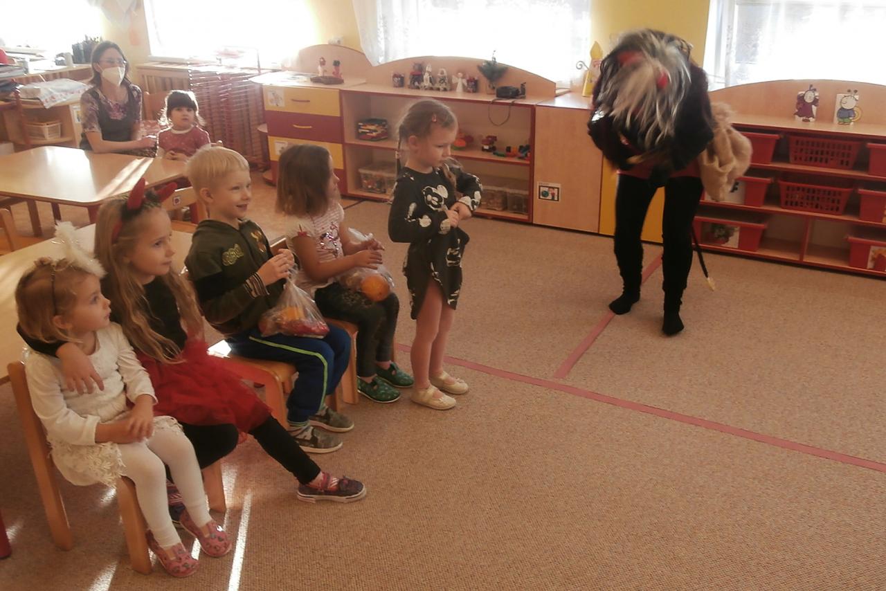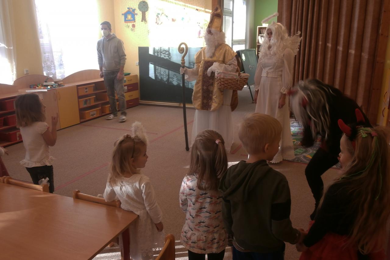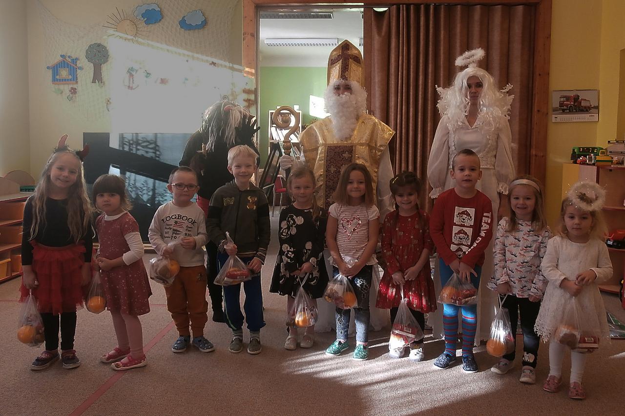 V pátek 3. prosince jsme dopoledne v mateřské škole přivítali Mikuláše, anděla s čertem, kteří přinesli nadílku hlavně hodným dětem. Odvážné děti přednesly pěkné básničky a některé doplnily vystoupení písničkami. Předškoláci ujišťovali návštěvníky, že vůbec nezlobí a případně jen "maličko".Nakonec stejně všechny děti dostaly balíčky naplněné ovocem a sladkostmi. Po nadílce si děti zahráli pohybové strašidelné hry a zacvičily na veselou melodii písně "Bu,bu,bu".