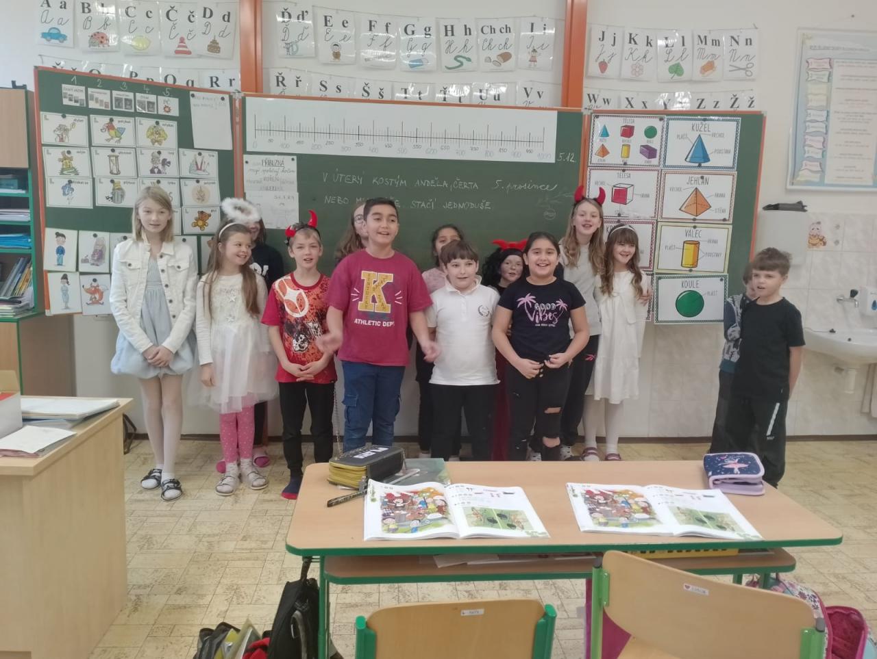 Už od rána bylo ve škole rušno, hemžila se tu spousta čertů a sem tam nějaký anděl. Děti nedočkavě vyhlížely Mikuláše s doprovodem. Jejich příchod ohlásil lomoz na chodbě. Jak to letos asi dopadne? Koho si s sebou odnesou? Ale všechno skončilo dobře. Mikulášovi jsme slíbili, že i příští rok budeme hodní, čerta jsme uplatili hezkými písničkami a když se přimluvil i anděl, dostalo každé dítko mikulášskou nadílku. A tak si s odlehčenou duší odpoledne děti zařádily na družinové čertovské diskotéce. Byl to užitý den pro nás všechny!
