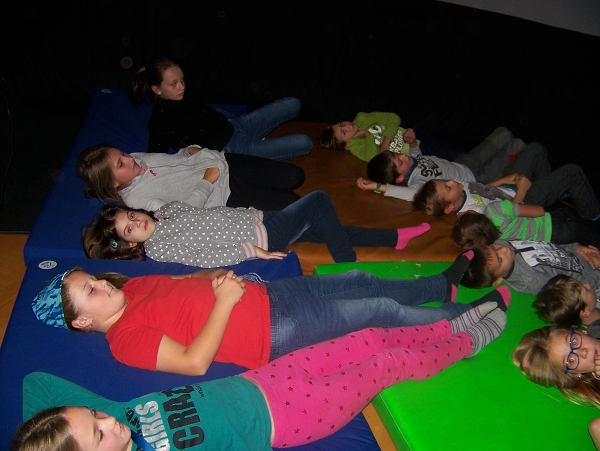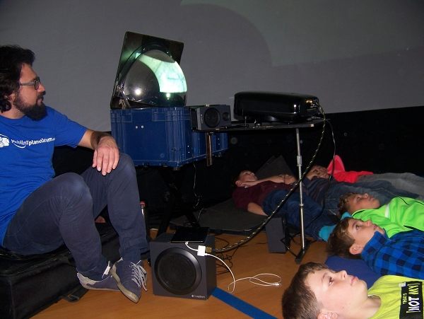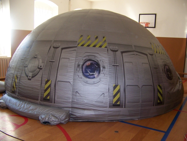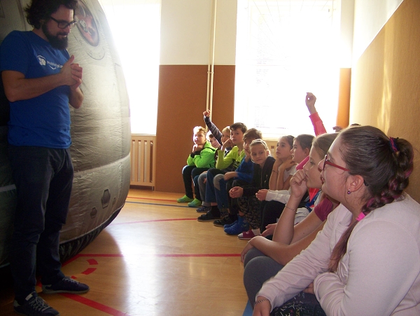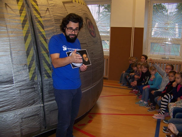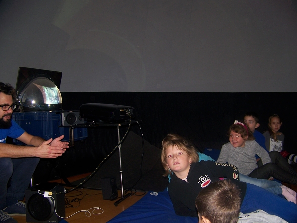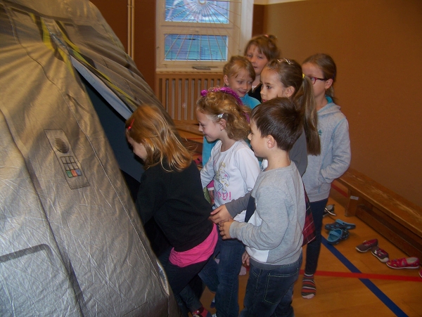V pondělí 9. října se děti do školy těšily víc než obvykle. Čekala je totiž návštěva s tajemným názvem: „Mobilní planetárium“. Ještě před zahájením vyučování některé děti zvědavě nakukovaly do tělocvičny a divily se, co to tam vyrostlo za podivný kupolovitý stan. S úderem osmé již bylo vše nachystáno a děti prvních a druhých tříd se mohly vydat na cestu poznání. Nejprve si s lektorem chvíli povídaly o planetách a poté byly vyzvány, aby nastoupily do vesmírně vyhlížejícího stanu zabírajícího polovinu tělocvičny. Tam na ně čekala čtyři zvířátka promítaná na planetární kupoli: ježek, zajíc, krtek a sova. Ta se rozhodla prozkoumat raketovou základnu. Kdyby tito kamarádi nepotkali chytrého myšáka, možná by se nikdy nedozvěděli spoustu zajímavých informací o planetách naší Sluneční soustavy a cestování do vesmíru. A protože naši nejmladší žáci byli u toho, odnesli si spoustu nových poznatků také. Po hodině plné zážitků se posádka vesmírného stanu zaparkovaného v naší tělocvičně vyměnila. Na palubu nastoupili žáci třetích a čtvrtých ročníků. Na ně již čekaly v programu Astronomie pro děti odpovědi na otázky: Jak vypadají planety Sluneční soustavy zblízka? Které planety jsou planetě Zemi nejvíce podobné? Jak veliké je Slunce a jak daleko je od Země? Čím se liší hvězda od planety? Co to je Alfa Centauri a jaká jsou nejznámější souhvězdí? Nechybělo zamyšlení, jak si lidé dříve vysvětlovali pohyb Slunce po obloze a jak souhvězdí získala svá pojmenování. Po další hodině se ve vesmírné kupoli pohodlně uvelebili i naši nejstarší žáci – páťáci. Pro ně byl připraven program Neuvěřitelný vesmír, díky němuž si prohlédli naši galaxii a pozorovatelný vesmír. Nebyla opomenuta ani magnetosféra, planetární mlhovina či prstence planet. Dozvěděli se, že práce astronoma není vůbec jednoduchá. Už jen proto, že vesmír je tak obrovský a možná i nekonečný, což téměř znemožňuje odpověď na otázku, odkud začít s jeho výzkumem. Od případné touhy strávit prázdniny ve vesmíru byli odrazeni upozorněním na strašlivou zimu a tmu, která v jeho nekonečných dálavách panuje. Všichni jsme si tak oddychli, že nekonečné taje vesmíru jsme mohli objevovat z měkkých žíněnek ve vytopené tělocvičně v pohodlné poloze vleže .